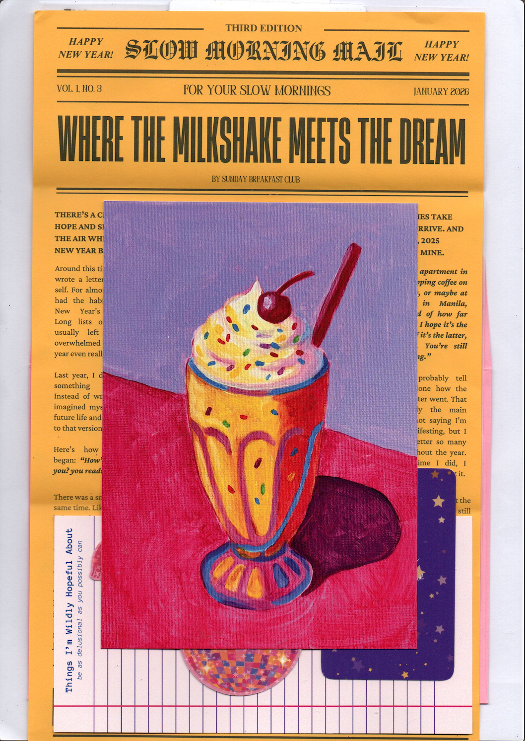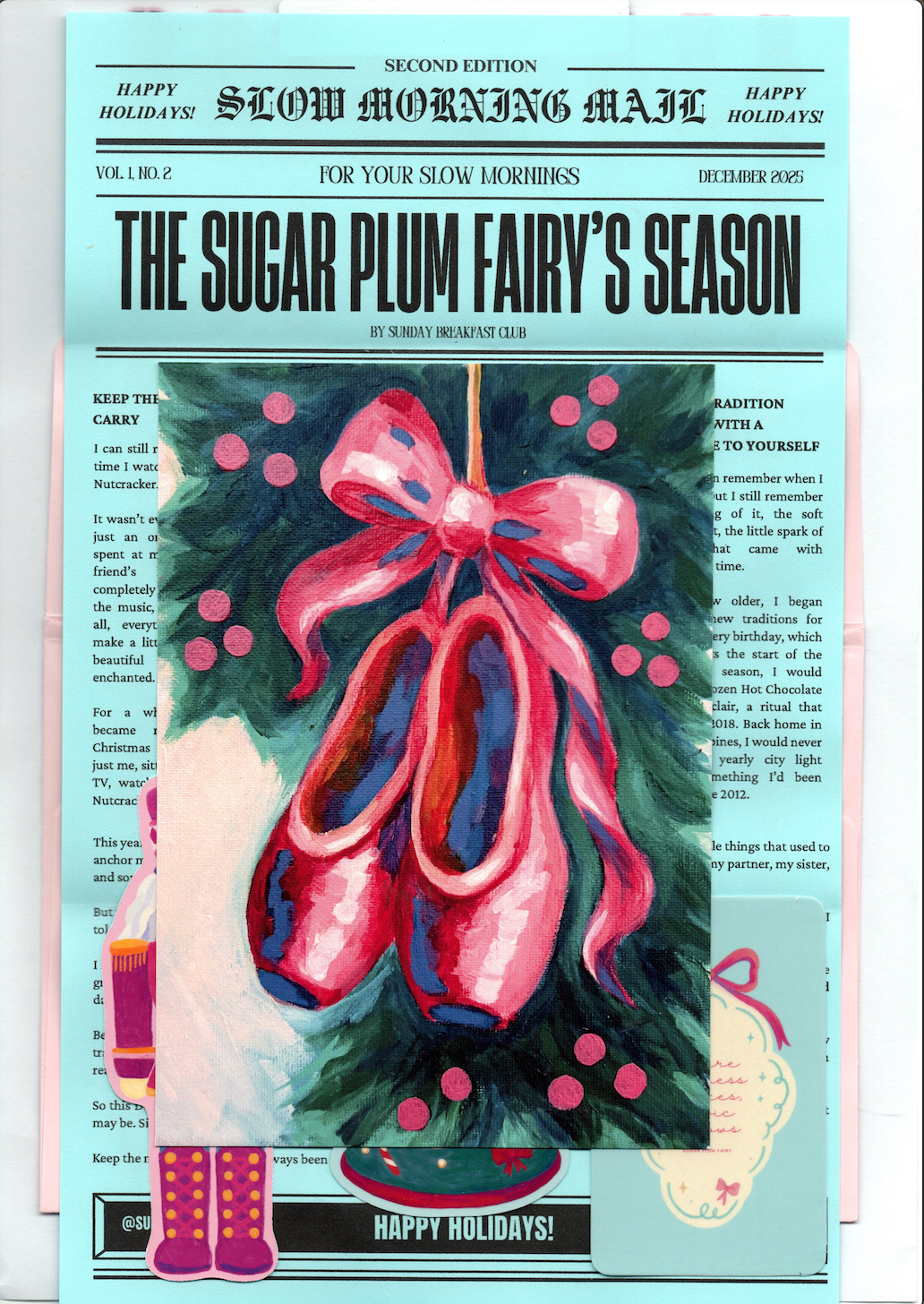 Slow Morning Mail is a monthly envelope of warmth and color, a tangible piece of the Sunday Breakfast Club world delivered to your doorstep. Each edition is thoughtfully packed with small treasures from the studio: painterly prints, cozy notes, and something special just for that month.
